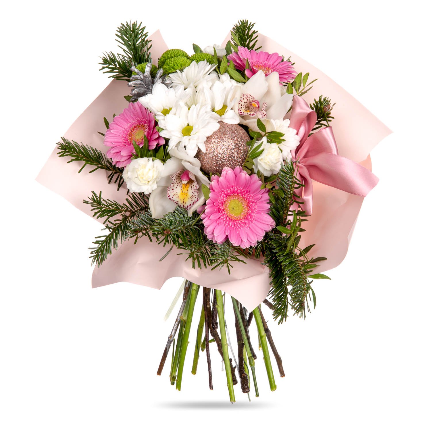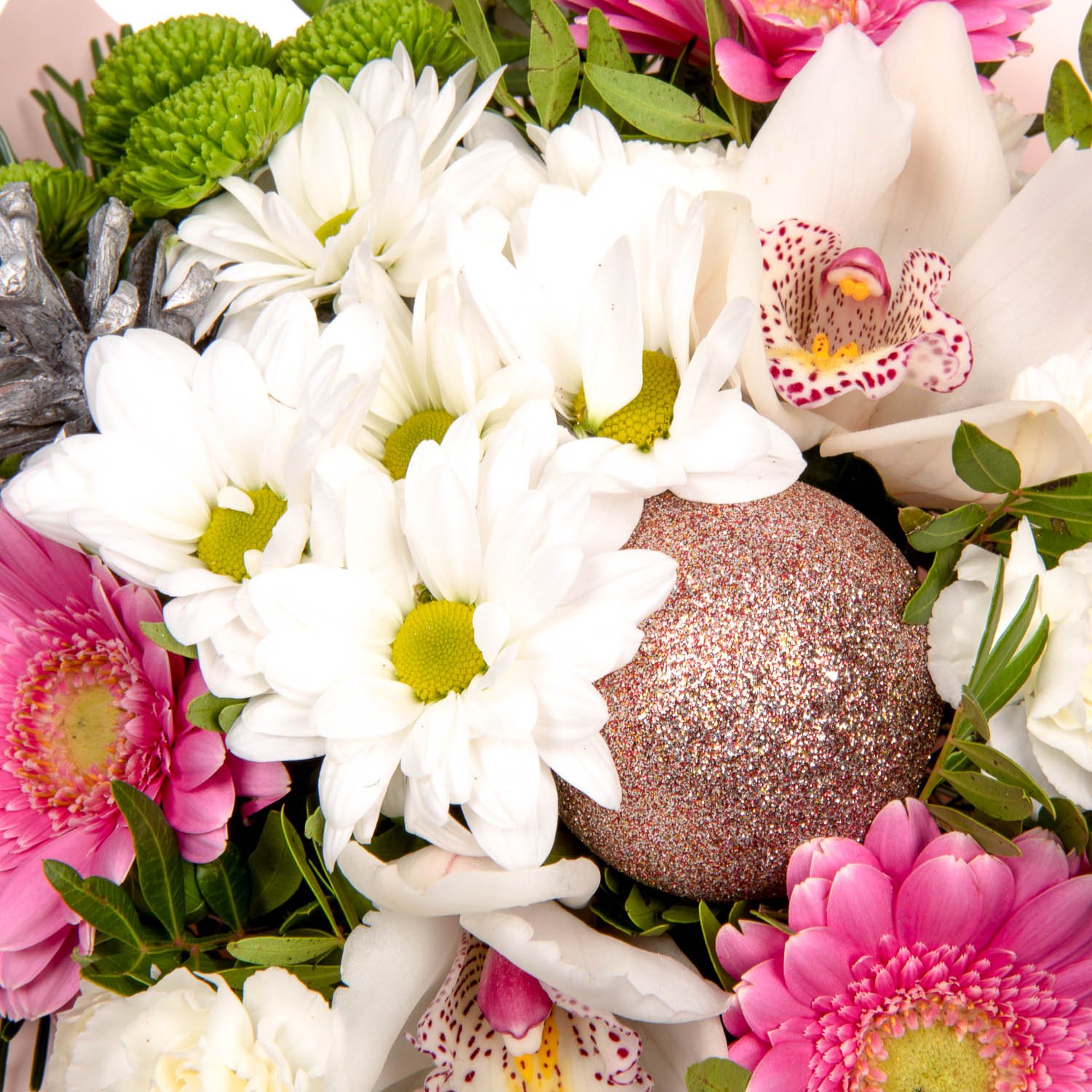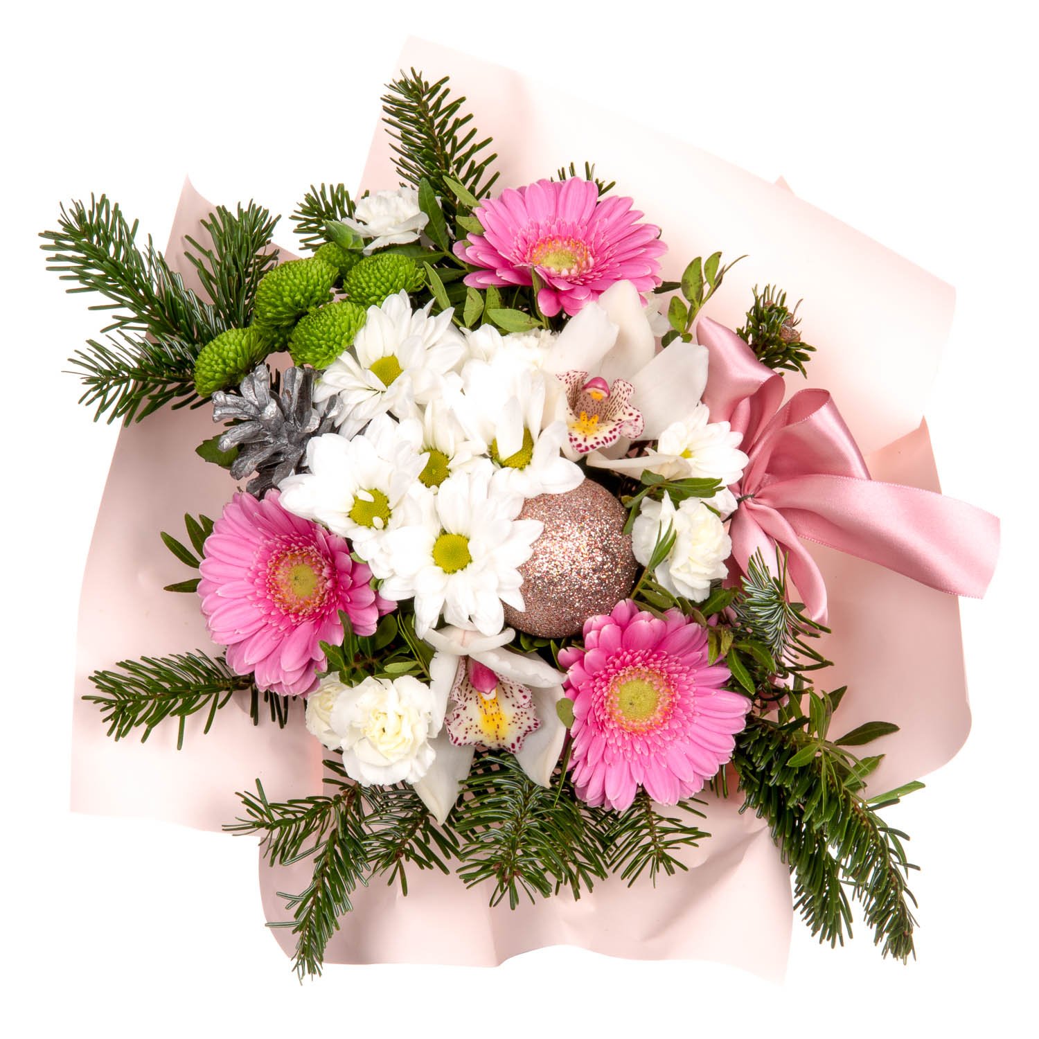 1 ks chrysantéma, 3 ks gerbera mini, 1 ks trsový karafiát, 1 ks chrysantéma santini, 2 ks květy orchideje, manžeta, mašle, vánoční dekorace a dekorativní zeleň