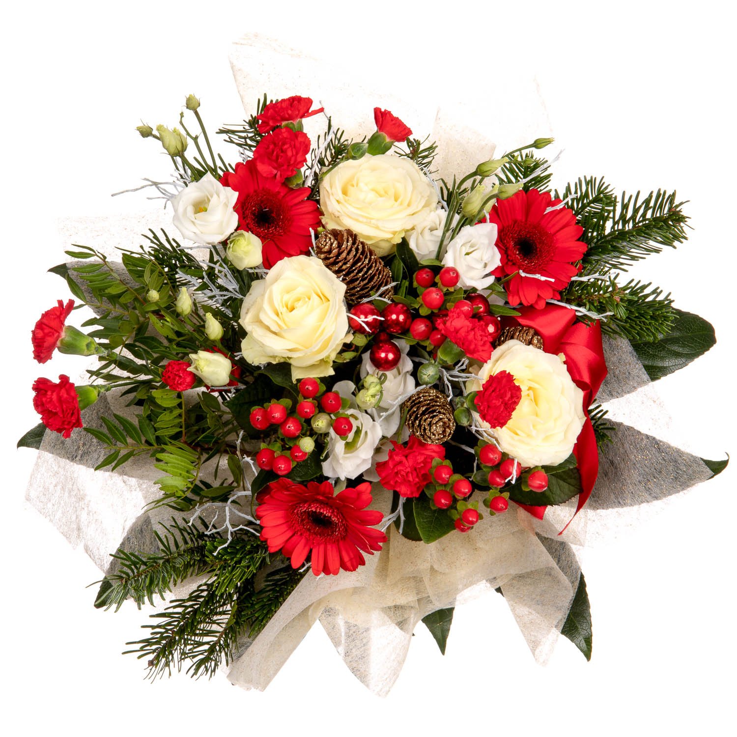 3 ks trsový karafiát, 3 ks růže, 3 ks eustoma, 3 ks gerbera mini, 3 ks hypericum, mašle, manžeta, vánoční dekorace a dekorativní zeleň
