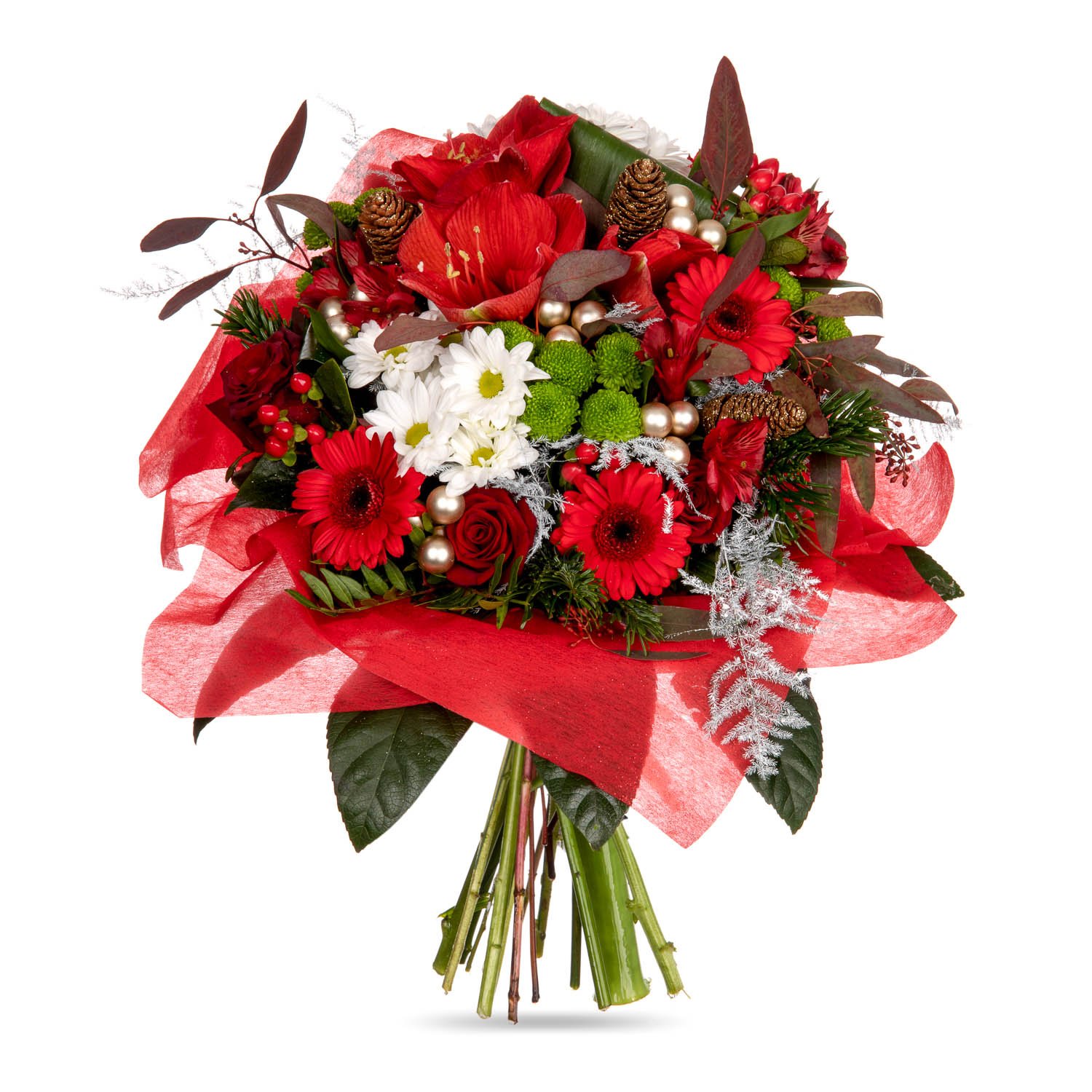 1 ks amarylis, 3 ks chrysantéma, 3 ks růže, 3 ks gerbera mini, 3 ks chrysantéma santini, 3 ks hypericum, mašle, manžeta, vánoční dekorace a dekorativní zeleň