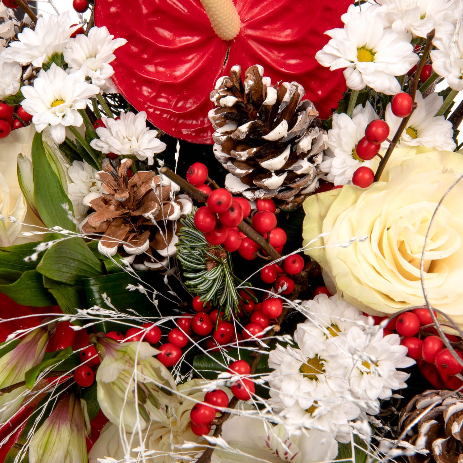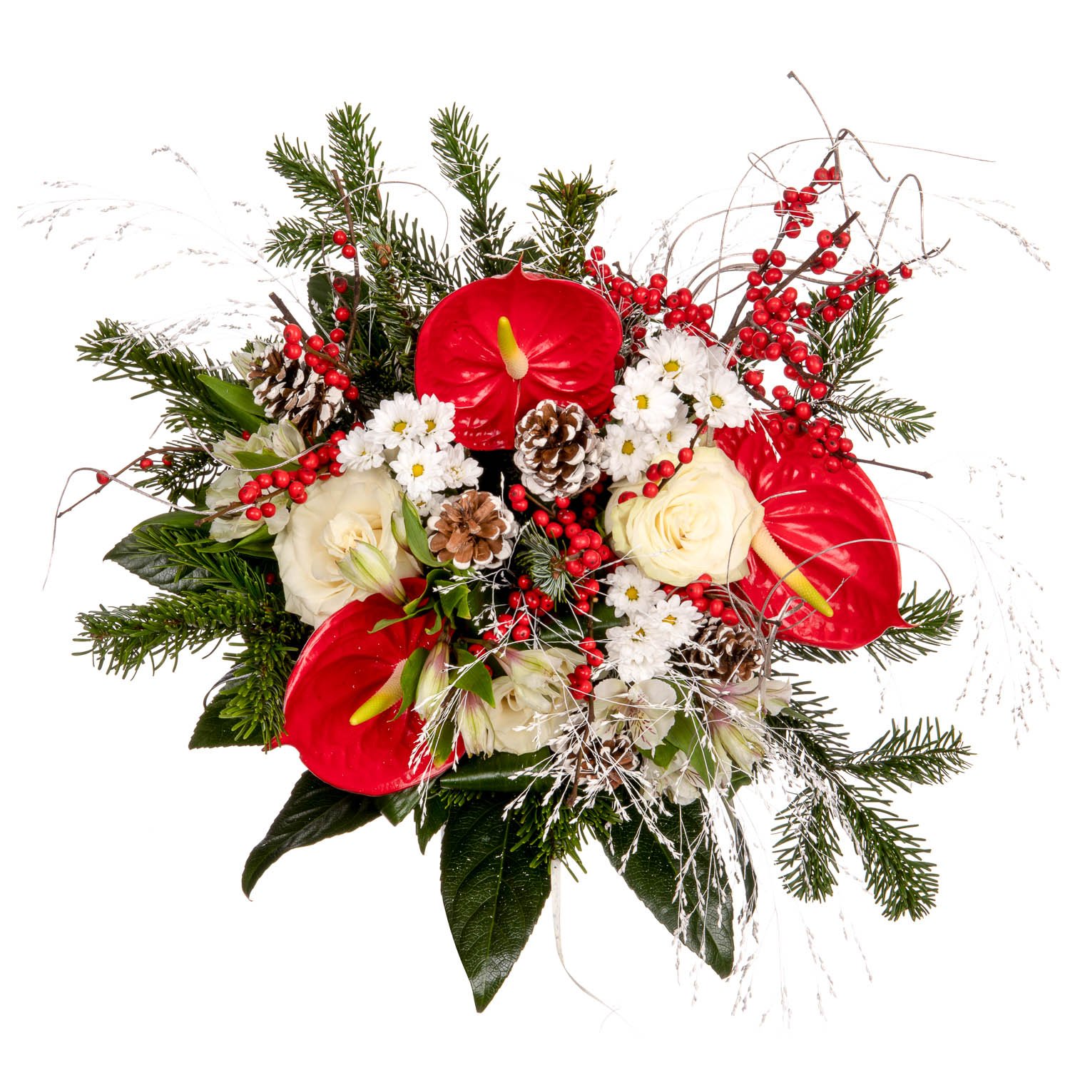 3 ks anthurie, 3 ks růže, 3 ks chrysantéma santini, 3 ks ilex, 3 ks alstromerie, vánoční dekorace a dekorativní zeleň