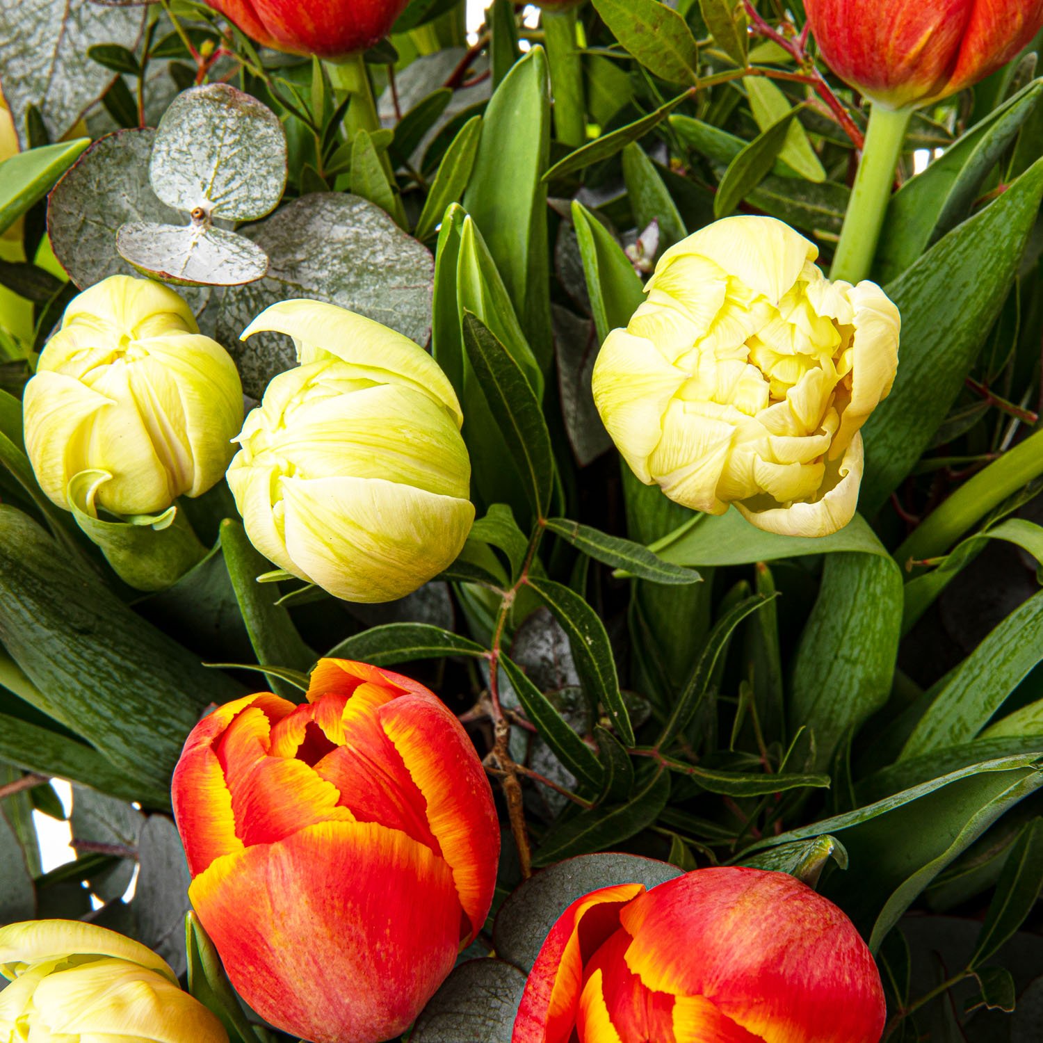 | Exkluzivní | 13 ks tulipán oranžový, 12 ks tulipán bílý, eucalyptus a dekorativní zeleň (salal) |