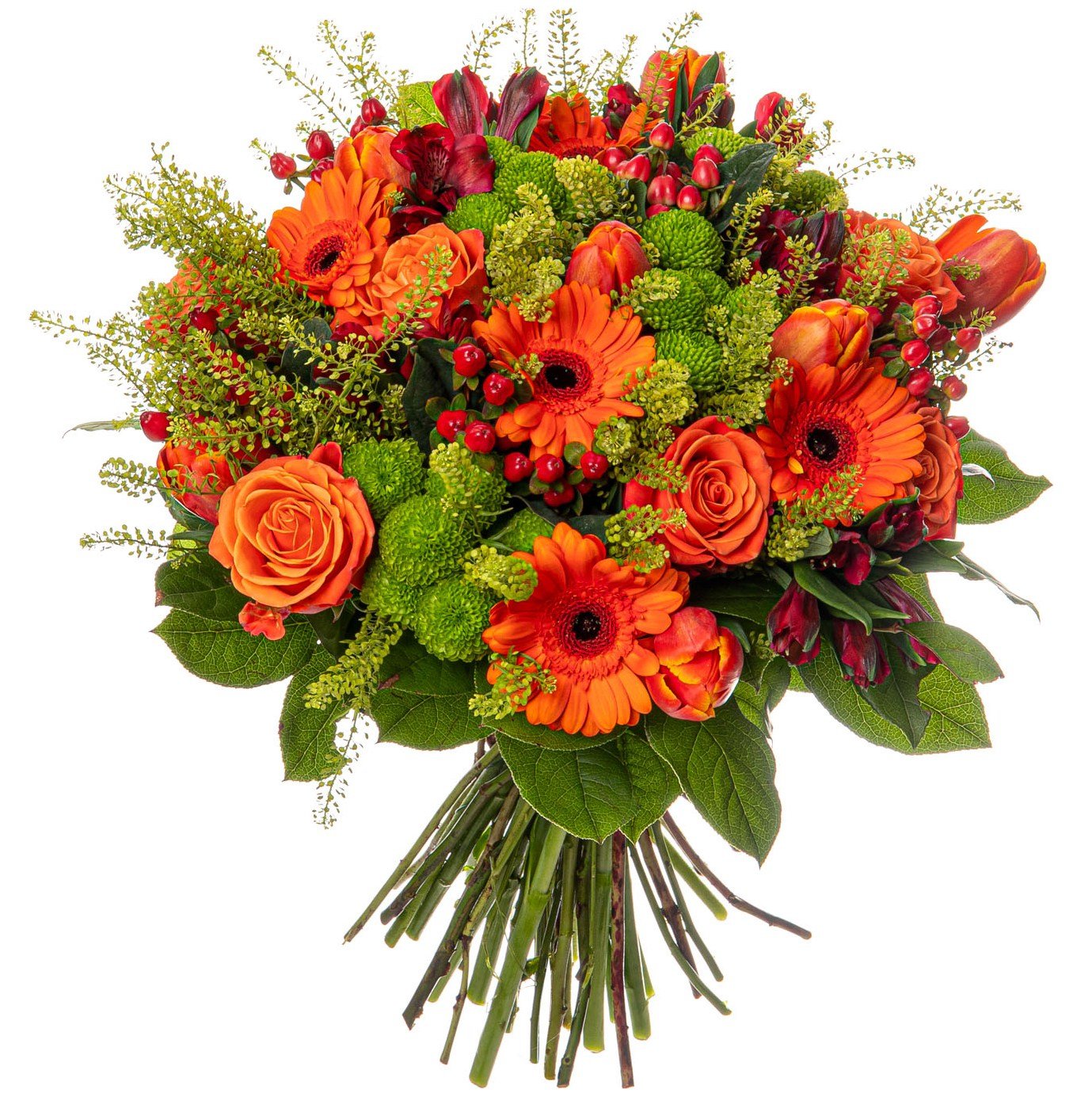 Tato kytice vyniká svou zářivou kombinací oranžových růží, gerber mini, tulipánů a červených alstromerií, které doplňuje svěží zelený santini a hypericum. Jednotlivé květy se nádherně prolínají a vytvářejí energickou a hřejivou atmosféru, která potěší při každé slavnostní příležitosti, pro radost i jako milý pozdrav. Kytici vázali naši zkušení floristé s důrazem na detail i pečlivý výběr květin. Doručujeme v den objednávky během pracovních dnů, s možností zvolit si přesný čas doručení. Na vaše přání zajistíme potvrzení o doručení e-mailem, abyste měli jistotu, že kytice bezpečně dorazila na správné místo.