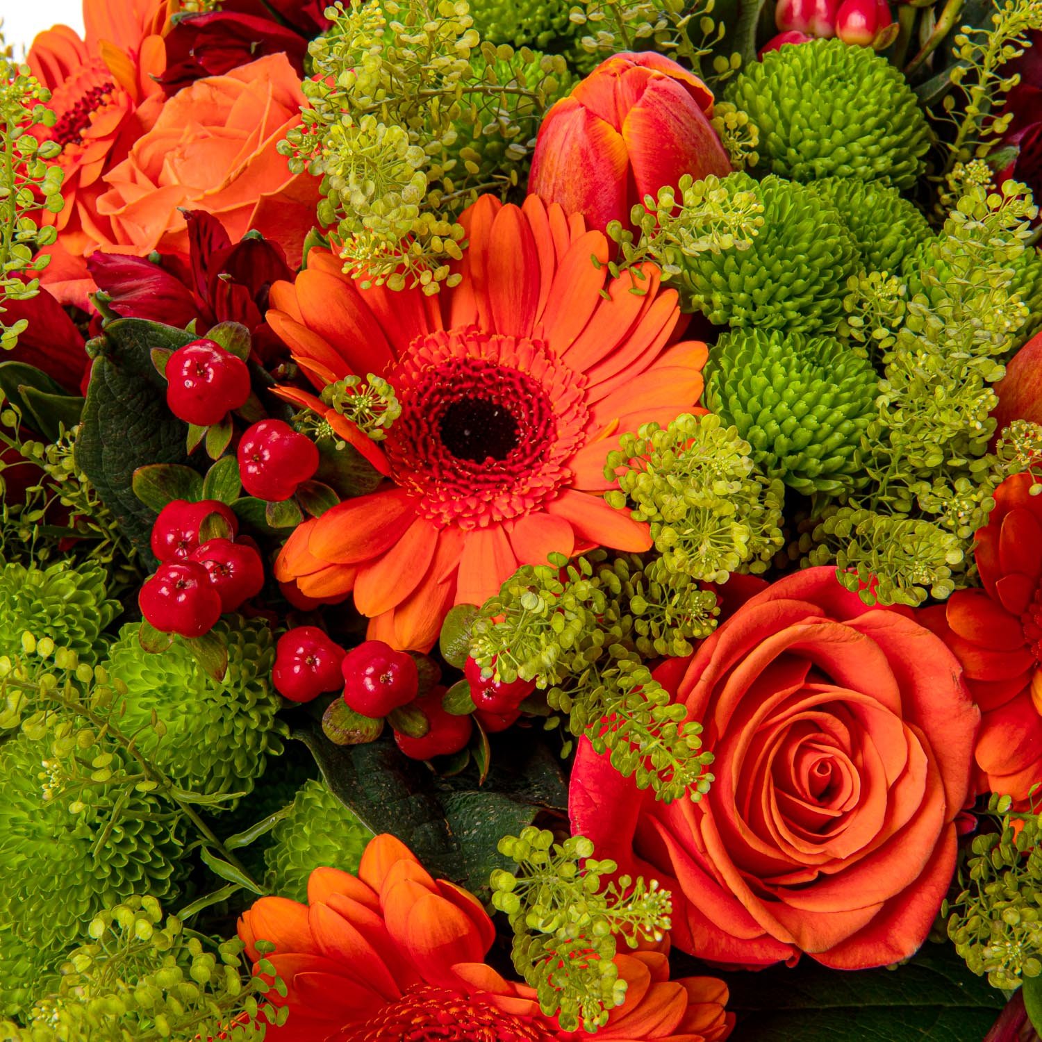 | Standardní | 3 ks gerbera mini oranžová, 3 ks santini, 3 ks alstromerie červená, 3 ks růže oranžová, 3 ks hypericum, 3 ks tulipán oranžový a dekorativní zeleň (pistacie, salal) |