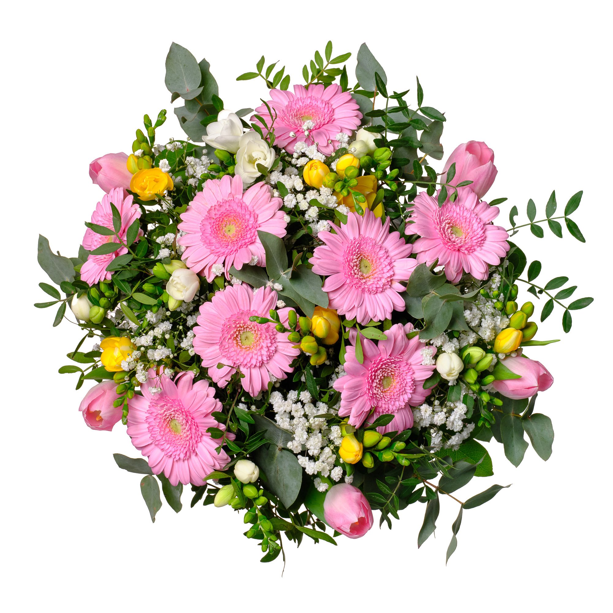 | Standardní | 3 ks růžová mini gerbera, 3 ks bílá frézie, 3 ks žlutá frézie, 2 ks gypsophila, 3 ks tulipán a dekorativní sezónní zeleň (pistacie, eukalyptus, salal) |